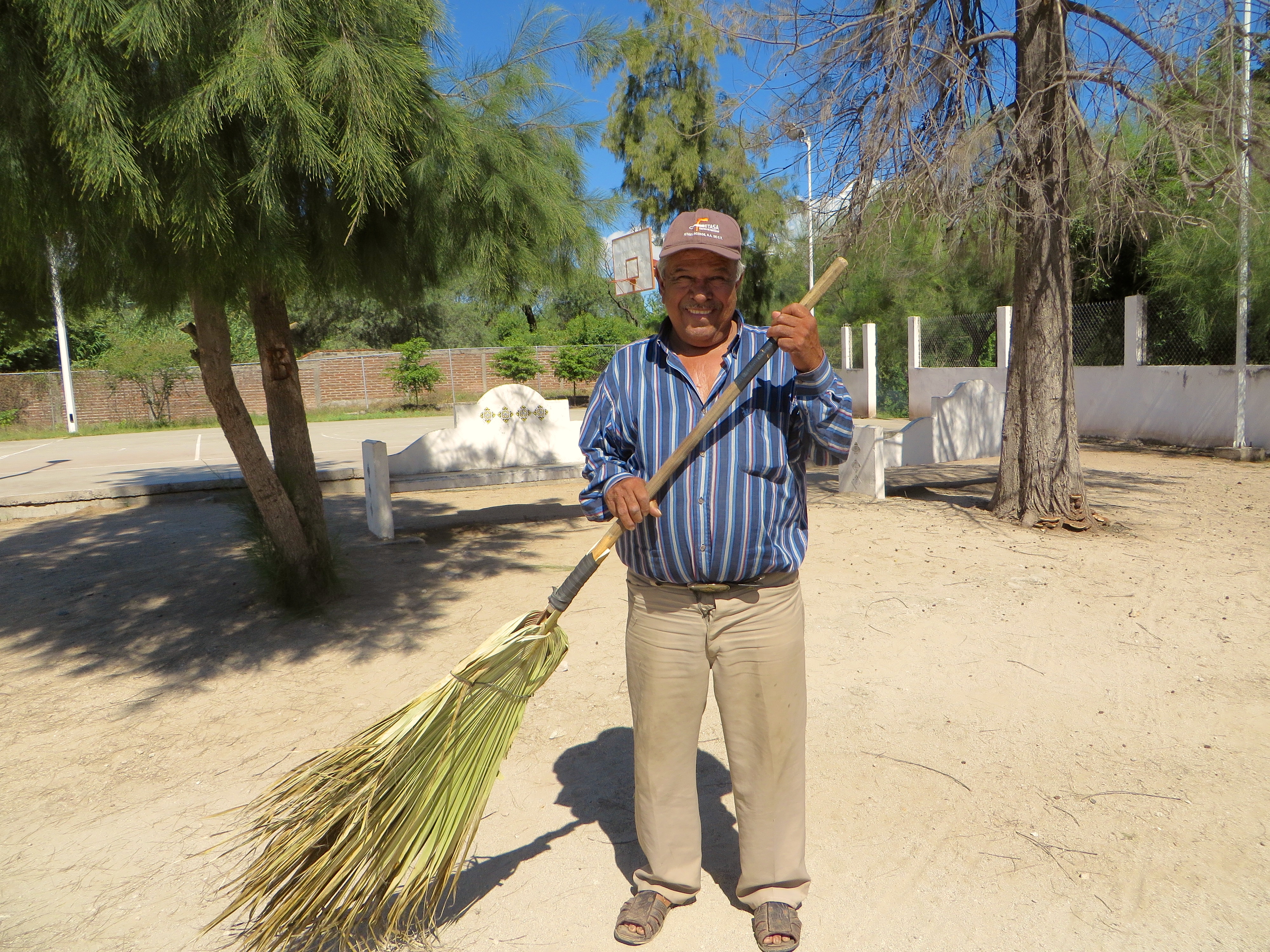 In the park up the street, Candelario Gastélum, a younger, rumpled, rounder gentleman, sweeps the basketball courts as well as the surrounding grounds. In Mexico people commonly sweep the dirt. In so doing they make lovely ephemeral patterns in the soil. For this task, Candelario uses a palm-frond broom of his own design. He makes a new one every few months.