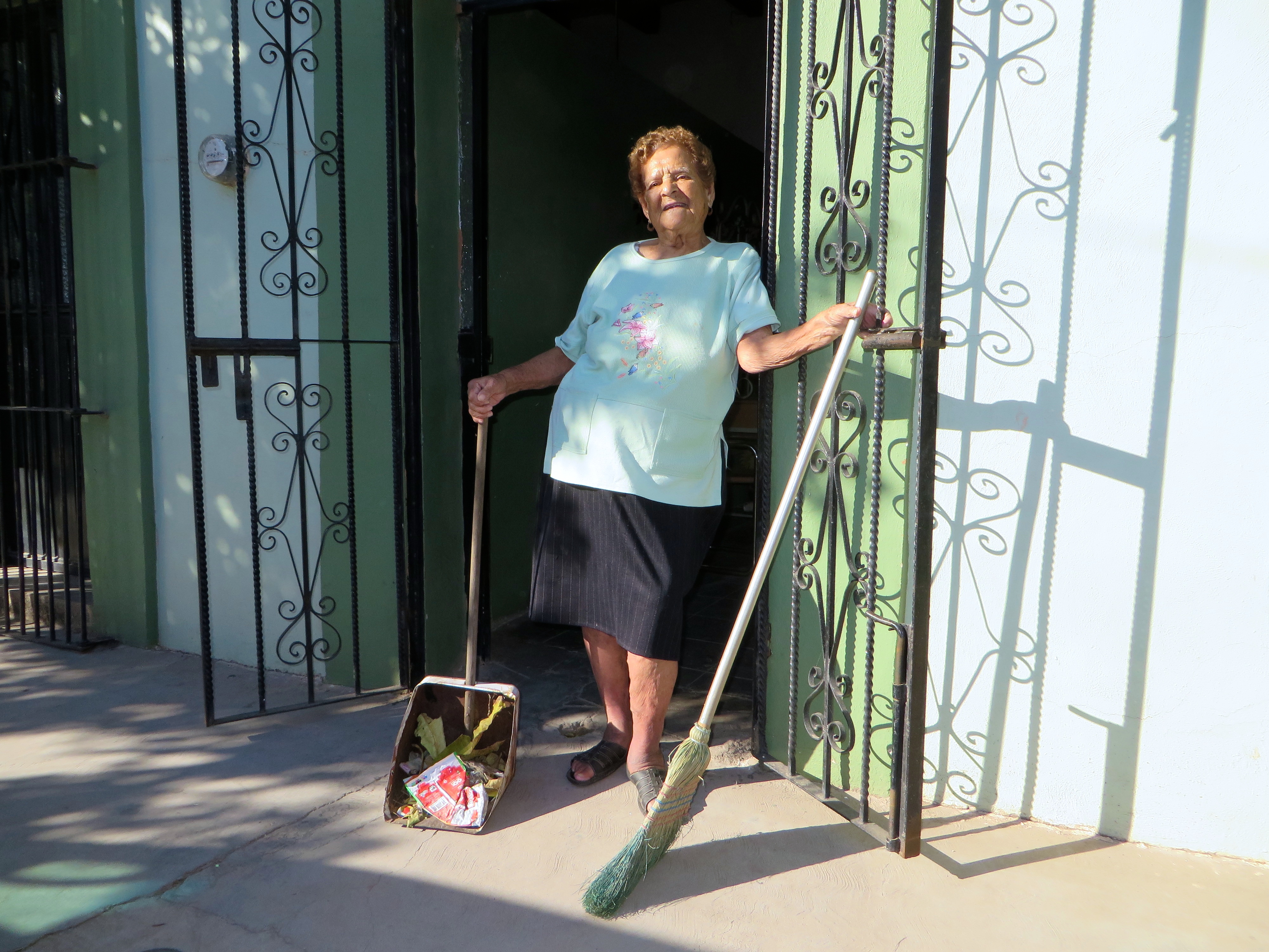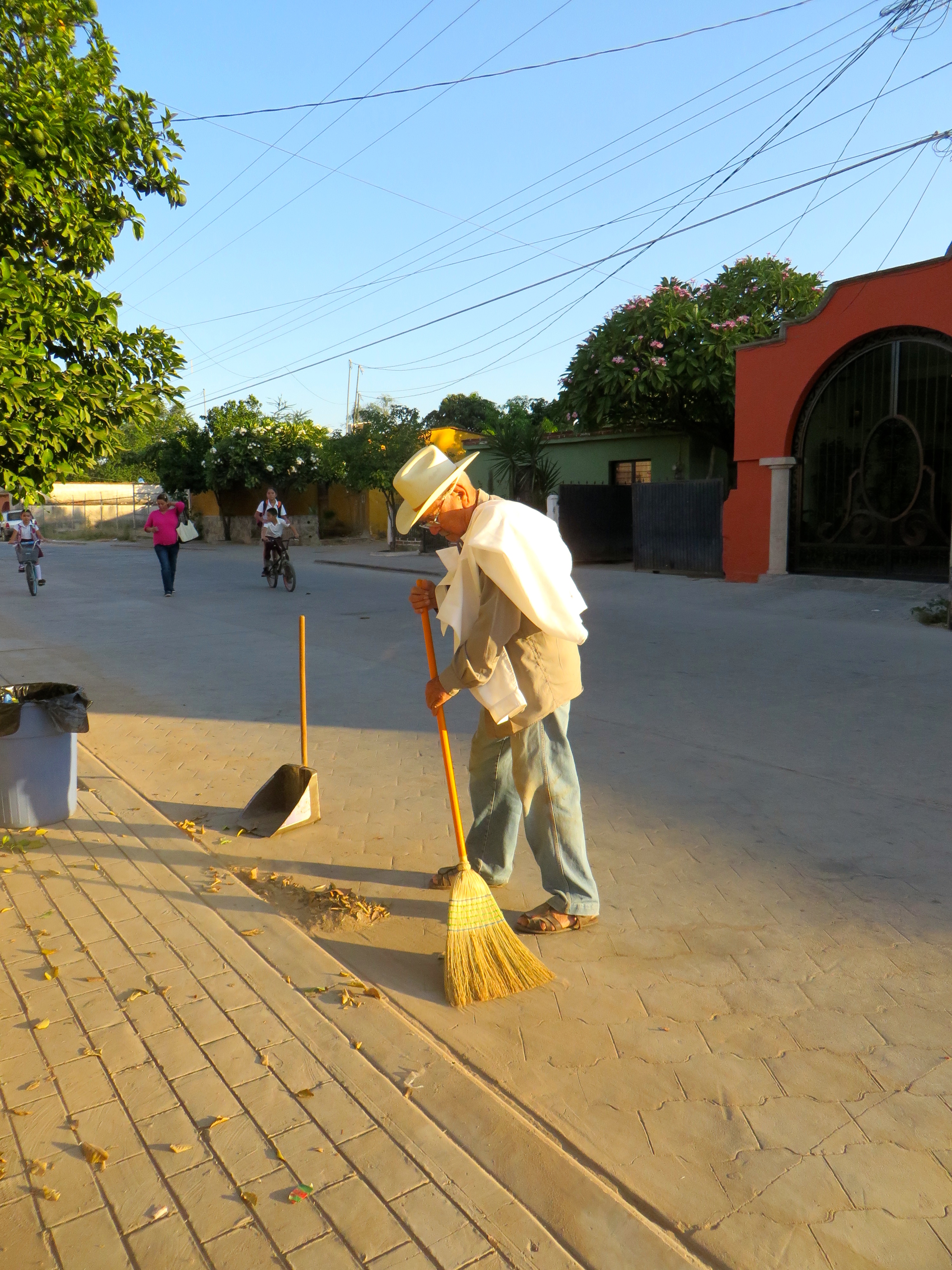 Francisco and Candelario are public workers, hired by the city to sweep the streets and public spaces of Alamos. Householders and housekeepers — men and women — are just as religious about tidying their own domains. Hardly a morning goes by that I don’t see Doña Sara, our 90-year-old neighbor a few doors to the east, out sweeping her stoop and sidewalk. Don Chato, the caretaker of a house a few doors to the west, bikes to work and starts his day sweeping his stretch of sidewalk. These are just the people I know. There are many others in our neighborhood and all across Alamos who emerge every morning from their houses to sweep.