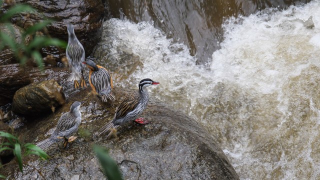 Maybe five or ten minutes passed. The pair kept advancing the aqueous ladder. Perhaps they were 100 meters downstream from the bridge. Suddenly a third duck materialized from the swirl, then a fourth. By god, a family of Torrent Ducks.