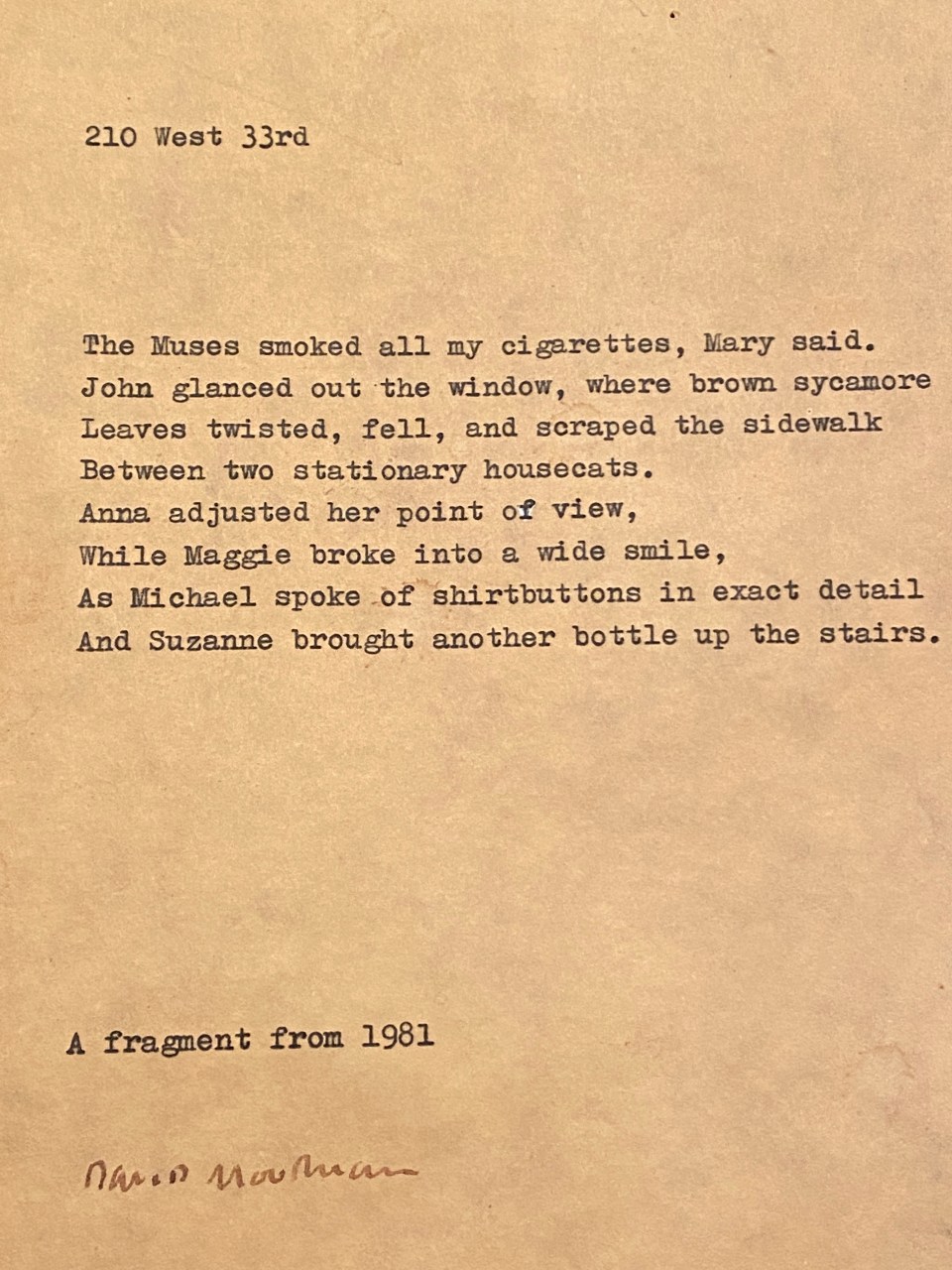 I have carried this fragment by Austin poet David Moorman around for forty years. From Texas to Minnesota to Tennessee to Nebraska to Arizona back to Minnesota where it now hangs on my refrigerator. The poem and I have weathered together. And I am still bringing another bottle up the stairs.