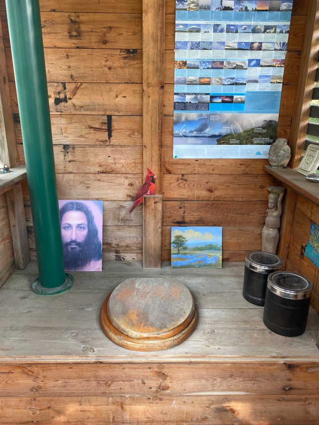 We have appointed the Chevy with art and various objects like rocks and shells. There is a winking Jesus and a cloud identification chart, which includes my photo of a shelf cloud taken near the Pike River. I use the Chevy from time to time (I found myself there more often this summer for sentimental reasons), and guests occasionally use it. But it is David’s place. He retires there almost daily when we are here and in all kinds of weather. The lowest temperature of his visits over the years was -35oF.
