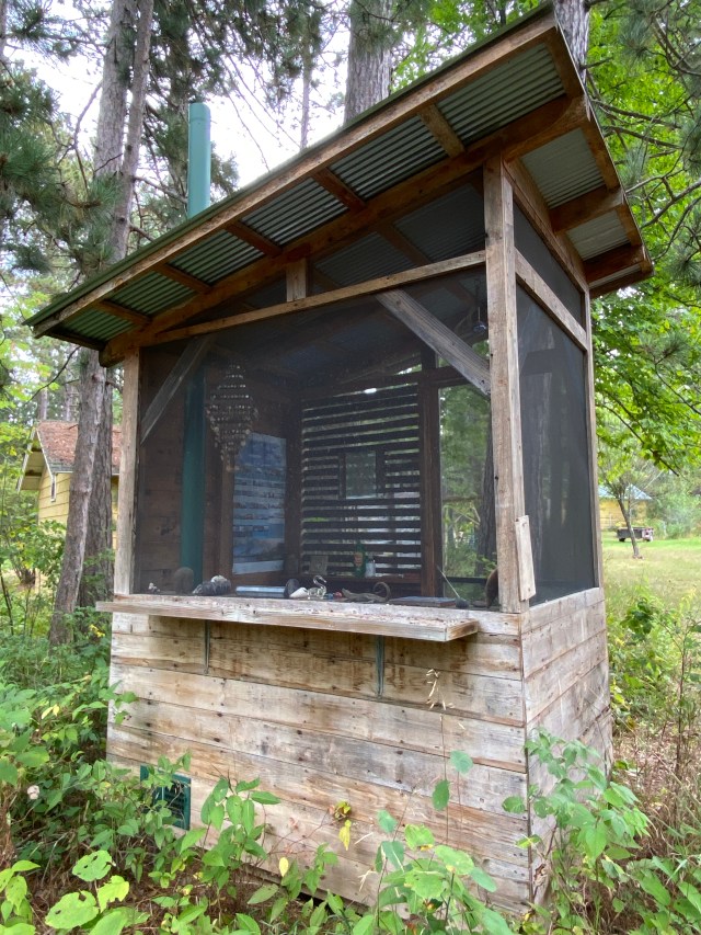 Standing like a sentry next to the wood shed and the sauna, it is an airy and serene place – David understands structural proportions. Rather than an airless, dark closet, the Chevy has screened windows, the better to enjoy the surrounding trees and buildings in all seasons, and a bird feeding tray for sunflower seeds, so visitors in their privacy can enjoy chickadees and nuthatches and the occasional pine siskin or redpoll up close.