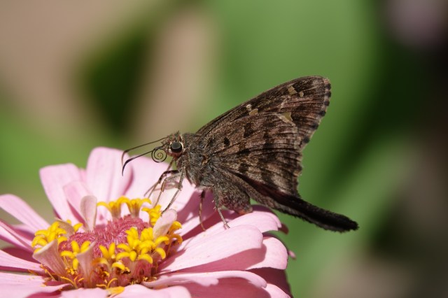 During the monsoon and as of the last week of December, Dorantes Longtail, Urbanus dorantes, was, by far, the most common and abundant butterfly in our yard, around town, and in the wilder areas we frequent around Alamos. They were everywhere. I wish I could extrapolate how many. It is a skipper, in the family Hesperiidae. Like the 3,500 or so other species of skippers, Dorantes Longtail is a modest brown, some might say dull, butterfly. One thing that makes the Hesperiidae fun (or frustrating) is the challenge of identifying most of them. It is like solving a puzzle. Some cannot be identified in the field even by experts. But Dorantes Longtail is easy to identify with its long tail and tiny translucent “window panes” in the forewings that glitter when it flies.